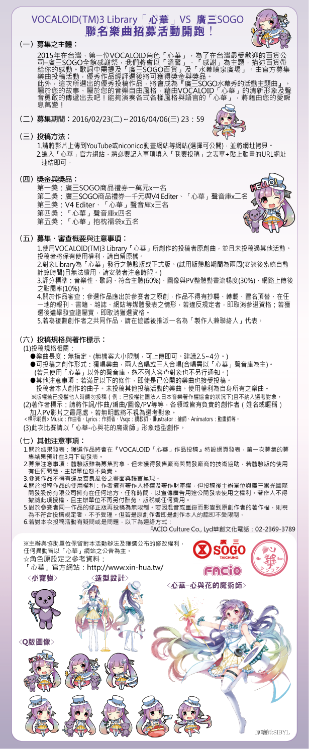 Read More VOCALOID(TM)3 Library「心華」 VS 北市府資訊局虛擬偶像230 聯名樂曲招募活動開跑! ★投稿用表單位置★ http://goo.gl/forms/pa6hWkEiVn